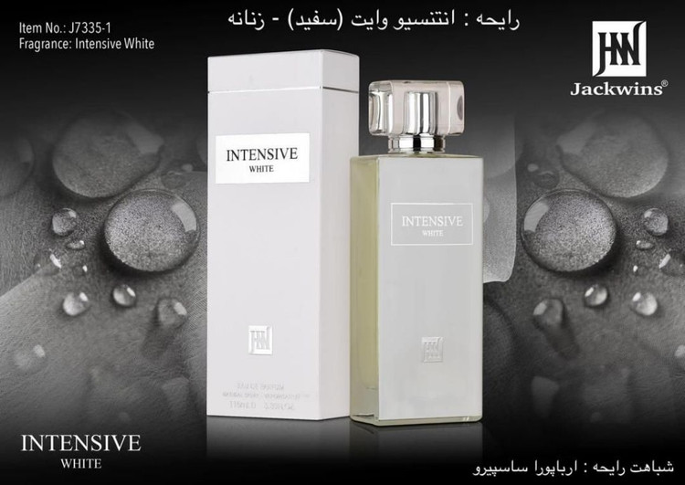 عطر ادکلن اینتنسیو وایت سفید Intensive white جانوین جکوینز عطری زنانه مردانه و شکیل با رایحه ی معتدل و شیرین و کمی وانیلی است و مشابه ادکلن معروف سوسپیرو اربا پورا می باشد. این عطر با رایحه ی شرقی ماندگاری بسیار طولانی مدت دارد و از ادکلن های پر طرفدار شرکت جانوین johnwin می باشد. عطر ادکلن اماراتی اینتنسیو وایت در امارات متحده عربی طراحی و تولید شده است و از ادکلن های با کیفیت وارداتی می باشد